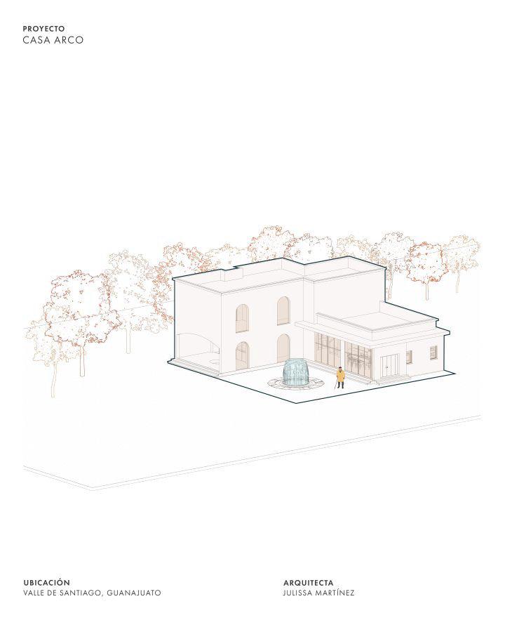 Fase conceptual para diseño arquitectónico de casa habitación de dos niveles rodeada de vegetación.