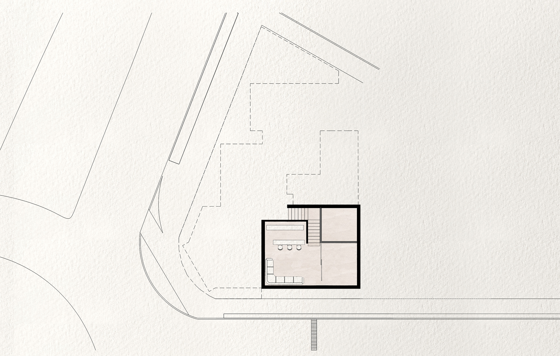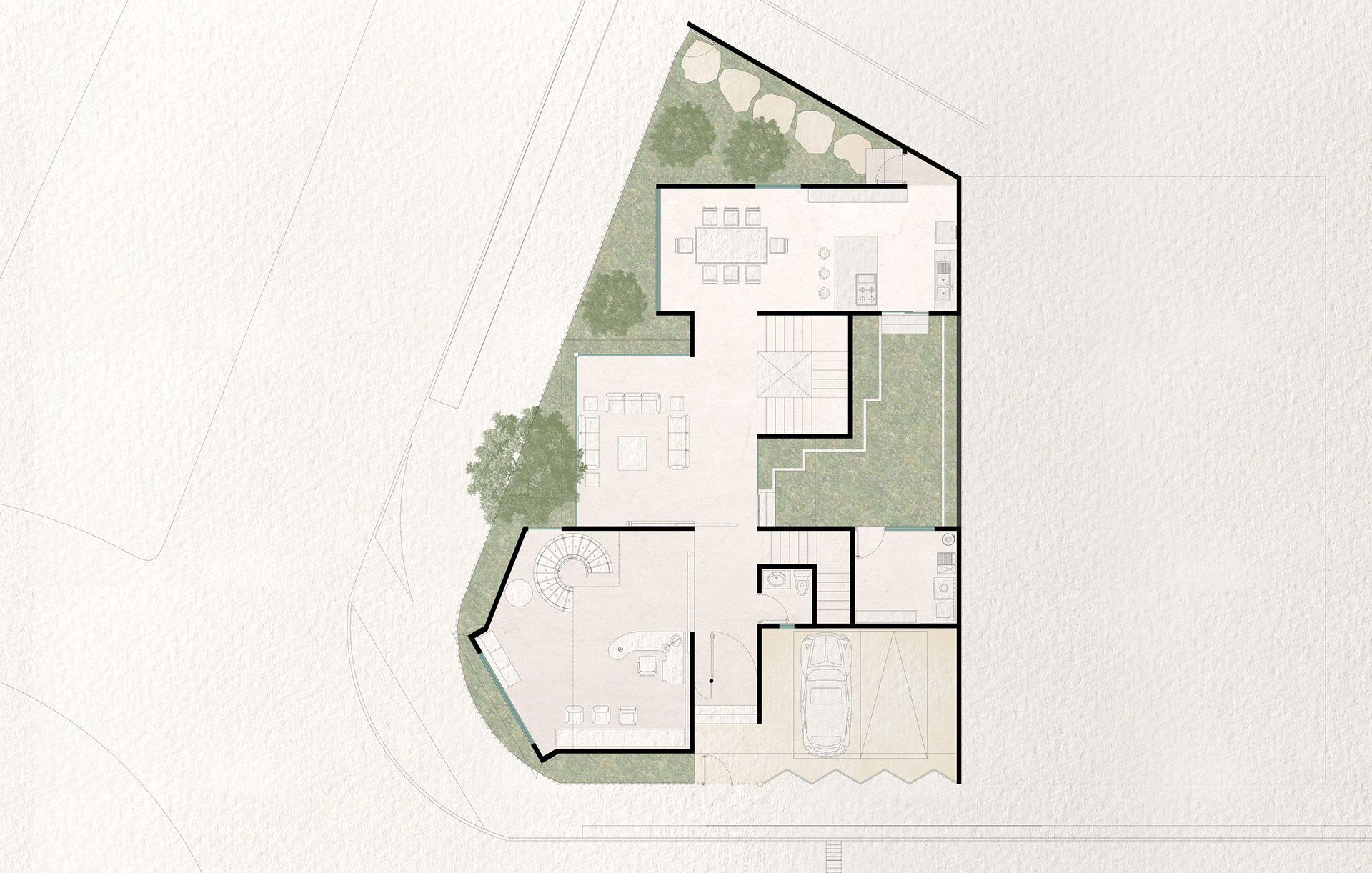 La geometría irregular del terreno se aprovecha como gesto plástico; los ángulos y retranqueos generan tensiones formales que recuerdan una composición abstracta, en la que el espacio se modela con la misma libertad que una obra de arte contemporáneo.