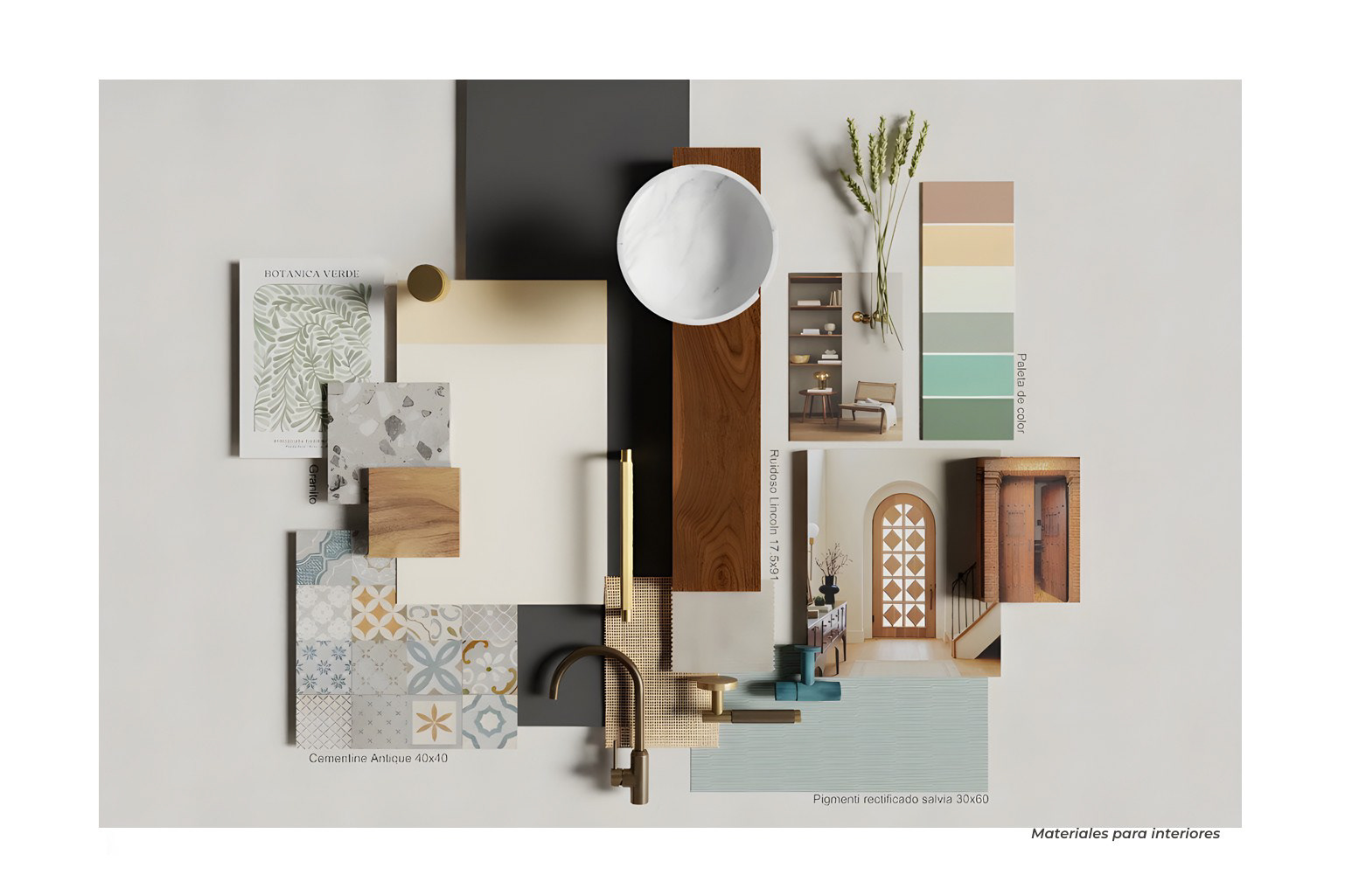 Jardín elevado: Un macetero en la parte lateral del patio contiene vegetación xerófita. Su acabado en azulejos con motivos geométricos grises y blancos le otorga un carácter artesanal y contemporáneo, aportando un contraste interesante entre la textura del azulejo y los tonos terrosos del pavimento.