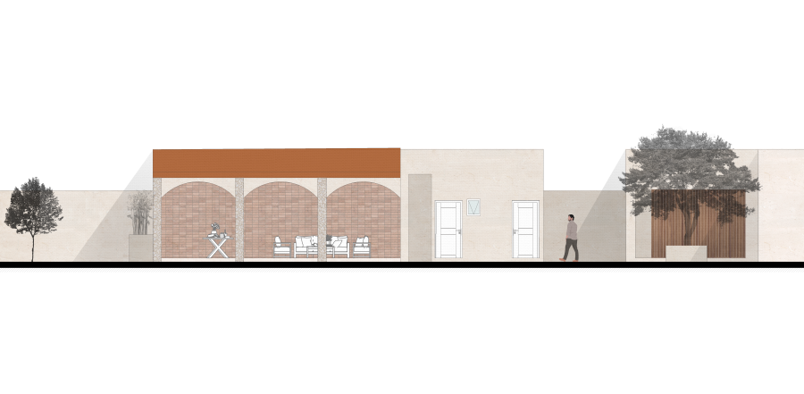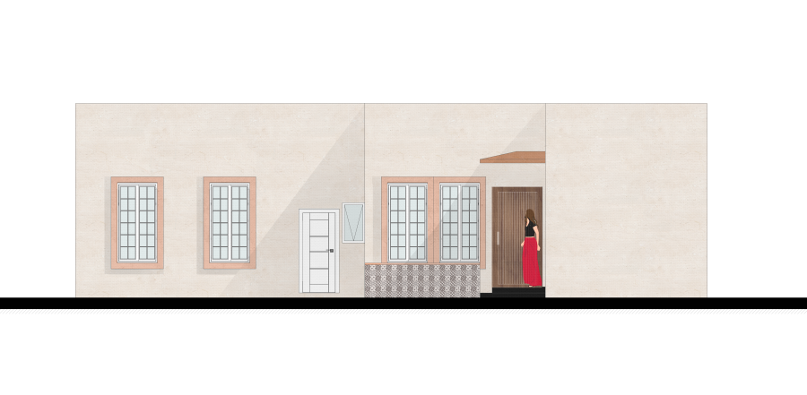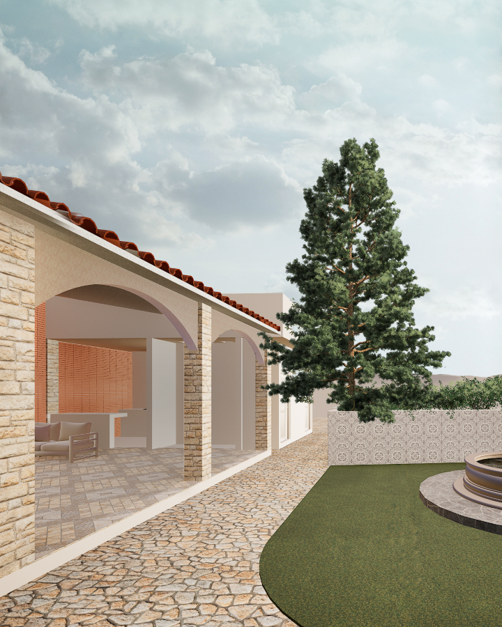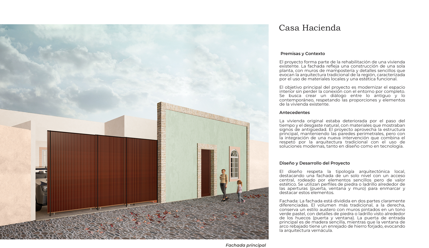 El proyecto forma parte de la rehabilitación de una vivienda existente. La fachada refleja una construcción de una sola planta, con muros de mampostería y detalles sencillos que evocan la arquitectura tradicional de la región, caracterizada por el uso de materiales locales y una estética funcional. El objetivo principal del proyecto es modernizar el espacio interior sin perder la conexión con el entorno por completo. Se busca crear un diálogo entre lo antiguo y lo contemporáneo, respetando las proporciones y elementos de la vivienda existente.