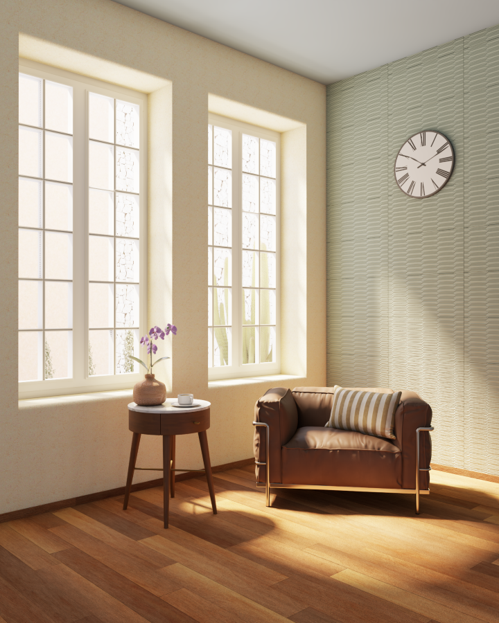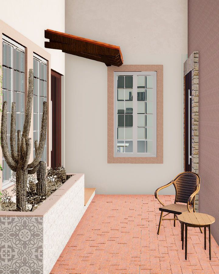 Revestimientos: Los marcos de las ventanas están resaltados por un recubrimiento de mampostería o piedra en tonos terrosos que enmarcan los huecos, aportando una textura que armoniza con el resto de los elementos del patio
