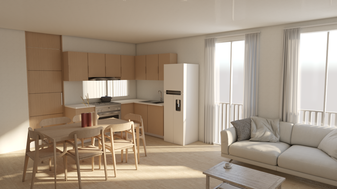 La zona social está diseñada como un solo espacio interconectado donde la cocina, el comedor y la sala se articulan sin barreras físicas, promoviendo un uso flexible del espacio.