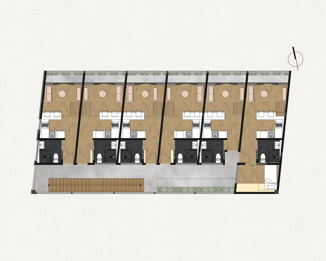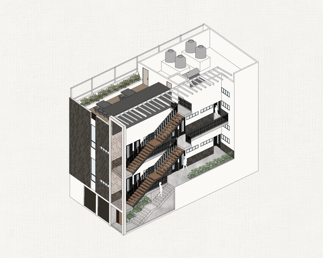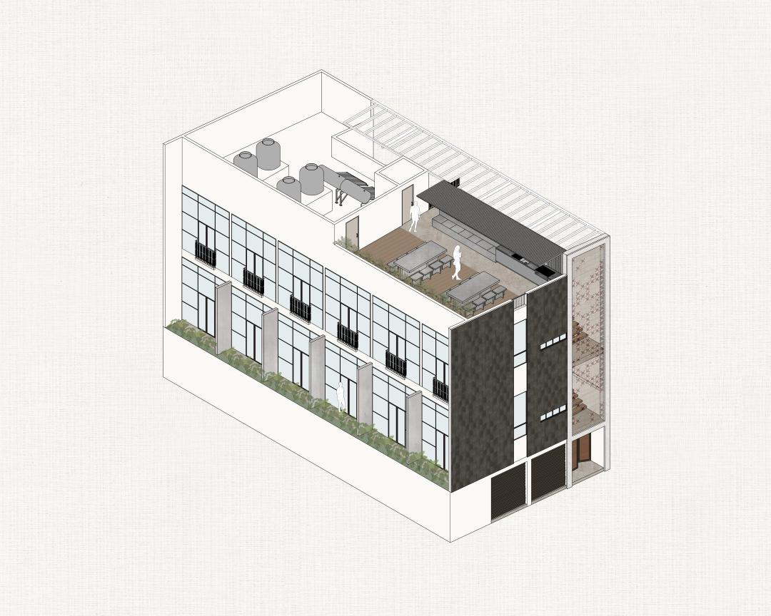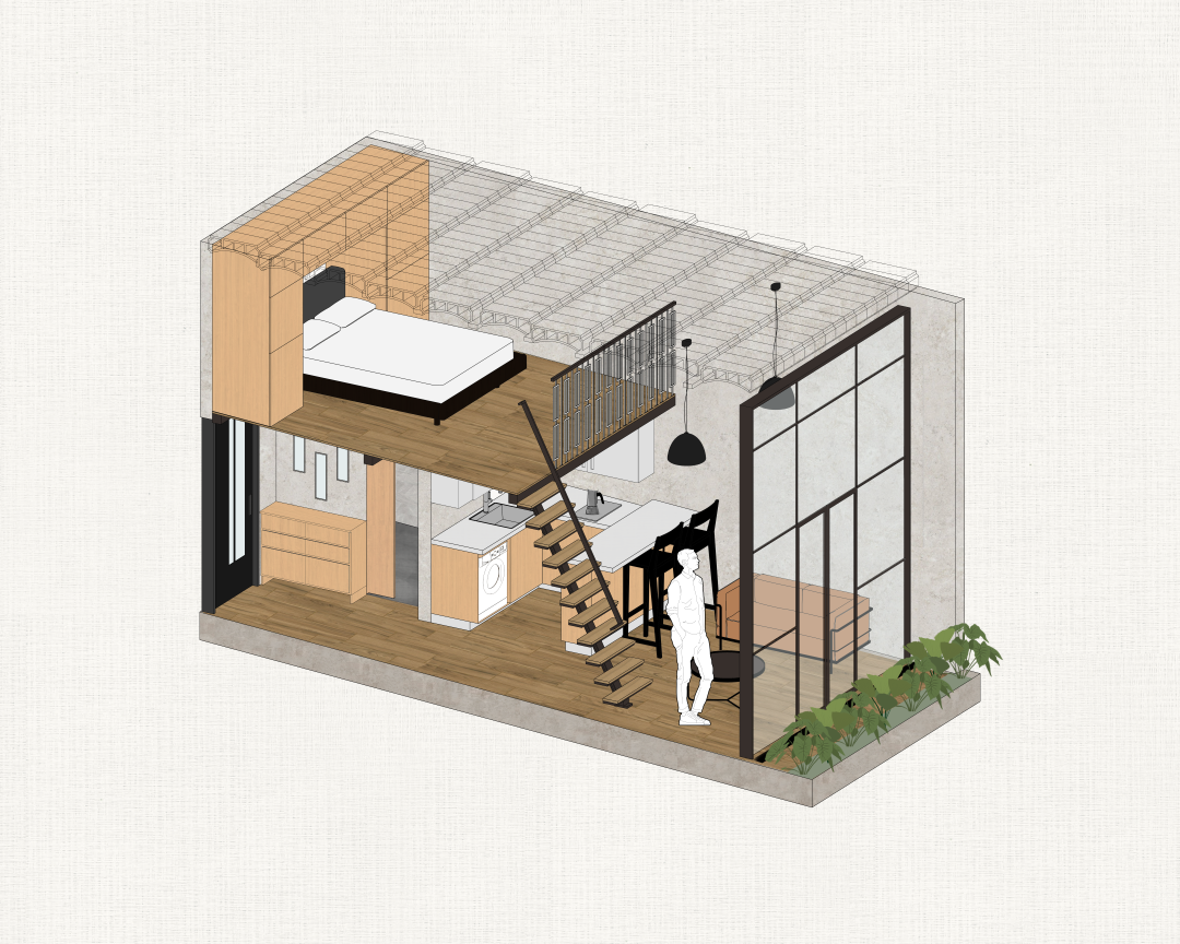 Este proyecto representa una propuesta de vivienda compacta en tipología loft, pensada para optimizar el uso del espacio en un contexto urbano denso. El diseño se caracteriza por su simplicidad formal, claridad funcional y el uso estratégico de materiales aparentes y cálidos, que equilibran lo industrial con lo minimalista.