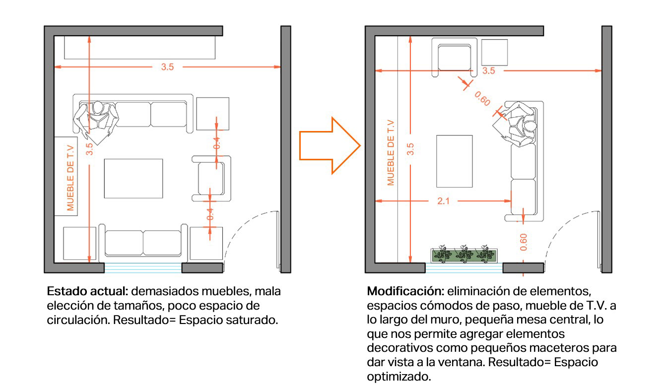 Antes de adquirir cualquier mueble, revisa cuidadosamente sus medidas y planifica dónde lo colocarás. Considera siempre las medidas mínimas de paso (0.60 m) además del volumen del mueble. Muchas veces compramos solo porque “se ve bonito”, pero en la práctica puede convertirse en un estorbo.