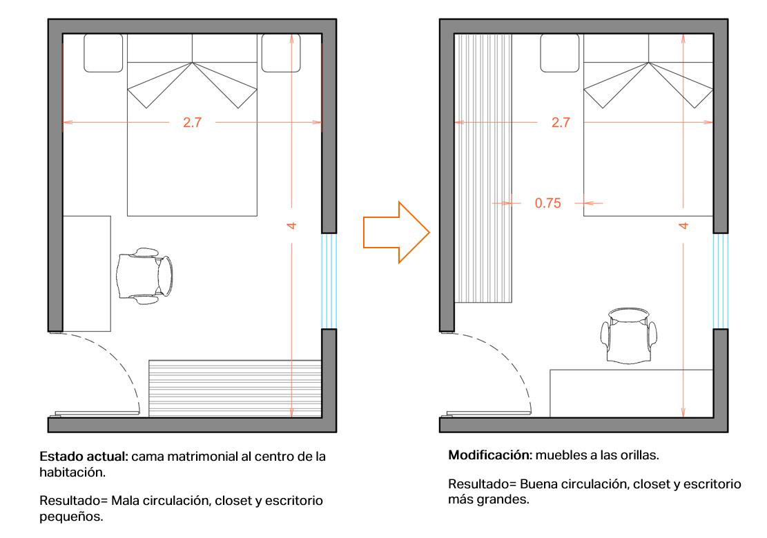 Esta estrategia funciona especialmente bien en salas, estudios y recámaras pequeñas, donde cada centímetro cuenta. Al colocar los muebles contra los muros (como se muestra en la siguiente imagen) el espacio central queda libre y se convierte en un área de respiro visual.