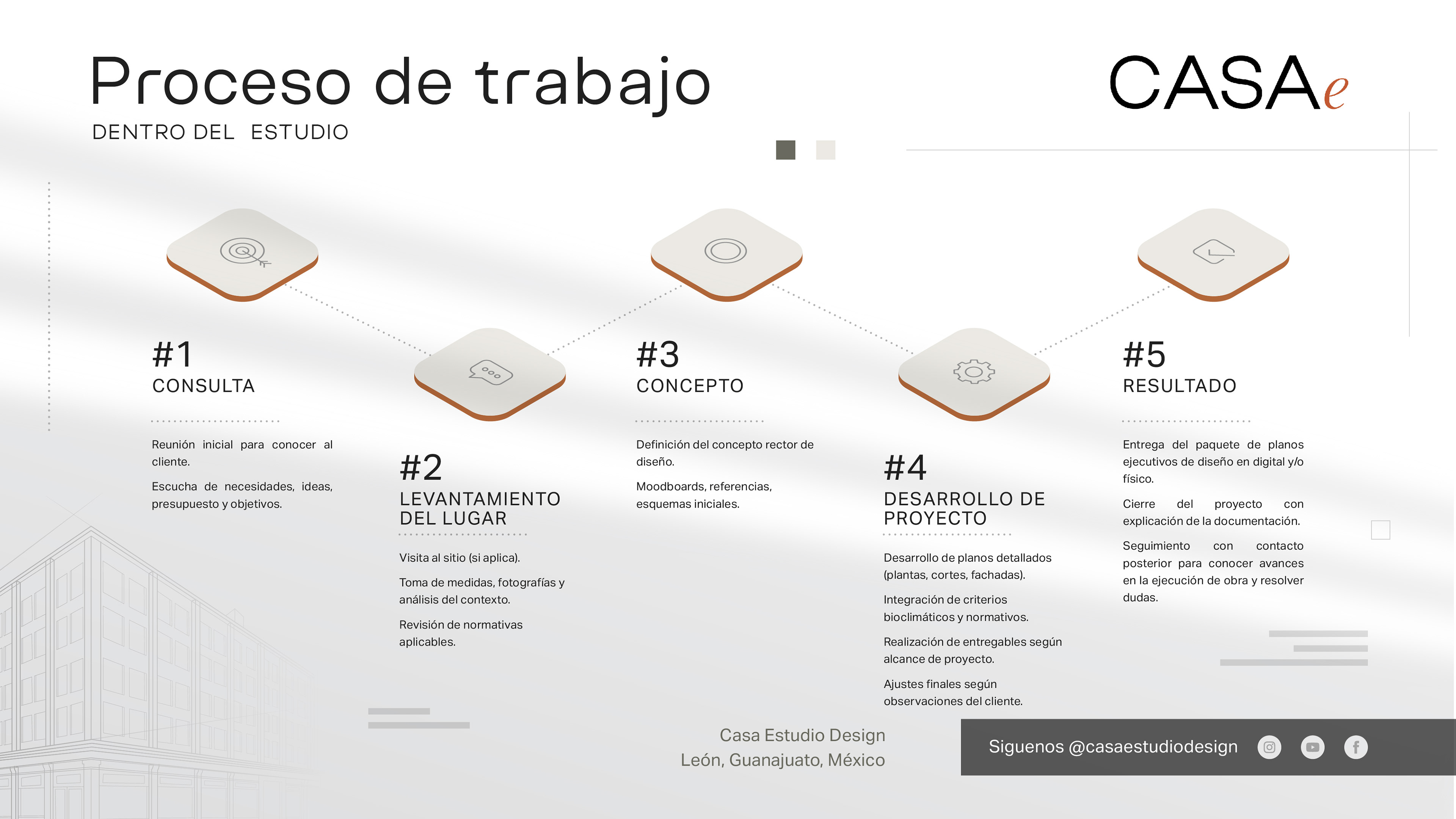 En Casa Estudio Design creemos en un proceso claro, ordenado y transparente. Cada proyecto se desarrolla de manera personalizada y siempre con comunicación constante. Por ello, en todas las etapas se realizan revisiones intermedias con el cliente, cuyo número y profundidad dependen del alcance contratado. Estas revisiones permiten afinar detalles, validar decisiones y asegurar que el proyecto avance en la dirección correcta.